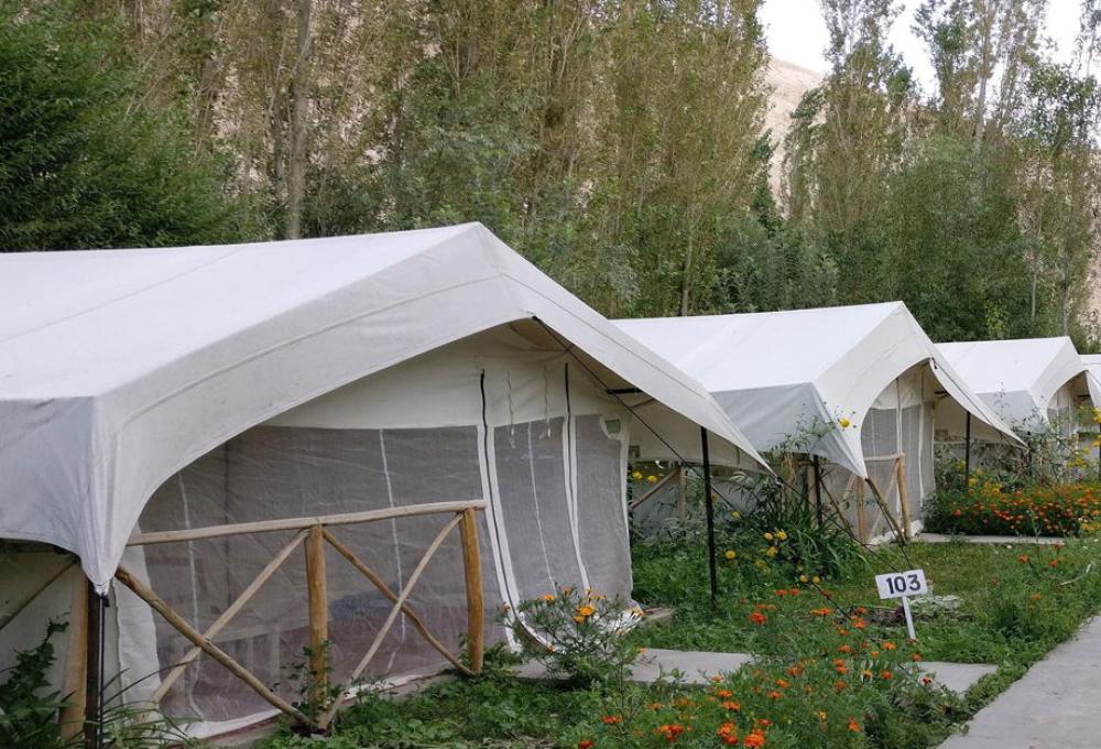 The camp is set in the mesmerizing village of Hunder, like an Oasis in the middle of cold desert in Nubra Valley situated in the north of Leh between the Karakoram and Ladakh ranges of Himalayas. Nubra likes at average altitude about 10,000 feet above the sea level. Hunder is approximately 160 km from Leh; it takes hardly 5-6 hrs drive to get there. The road to Nubra runs across Khardong-La (5,578 m) highest motorable road in the world. Nubra has acquired fame for its Sand dunes, the cold desert that surround it. Bactrian Camels and its breath-taking natural beauty.
